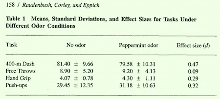 The study is: “Enhancing Athletic Performance Through the Administration of Peppermint Odor,” Bryan Raudenbush, Nathan Corley, and William Eppich, Journal of Sport and Exercise Psychology, vol.23, 2001, pp. 156-60. The authors, at Wheeling Jesuit University, explain: