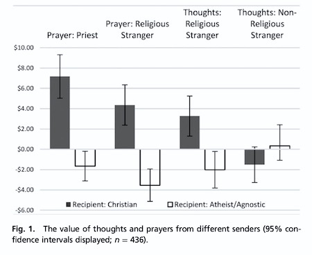 “A standard response of both policy makers and private citizens to hardships—from natural disasters to mass shootings—is to offer “thoughts and prayers.” Critics argue that such gestures are meaningless and may obstruct structural reforms intended to mitigate catastrophes. In this study, we elicit the value of receiving thoughts and prayers from strangers following adversity. We find that Christians value thoughts and prayers from religious strangers and priests, while atheists and agnostics are “prayer averse”—willing to pay to avoid receiving prayers. Furthermore, while indifferent to receiving thoughts from other secular people, they negatively value thoughts from Christians.”