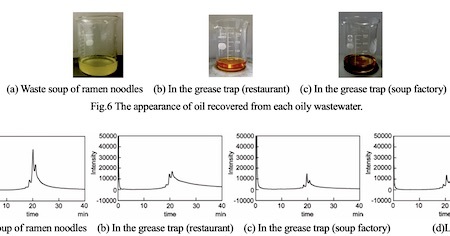 “This paper describes how to produce a biodiesel fuel (BDF) from the waste soup of ramen noodles, especially focusing on the recovery process of the oil (triglycerides) from a large amount of waste soup or the oily wastewater disposed of by pouring it down the sink by a ramen restaurant. By combining a semi-transparent bucket (~6 L) with a cock and solvent extraction, it is shown that oil can be recovered easily from 300 or more bowls of ramen noodle waste soup, with an energy profit ratio (EPR) of more than 5.2.”