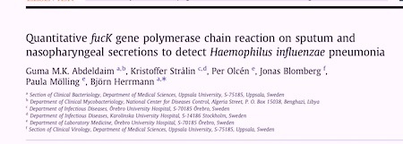 “Quantitative fucK Gene Polymerase Chain Reaction on Sputum and Nasopharyngeal Secretions to Detect Haemophilus influenzae Pneumonia,” Guma M.K. Abdeldaim, Kristoffer Strålin, Per Olcéne, Paula Möllinge, and Bjorn Herrmann, Diagnostic Microbiology and Infectious Disease, vol. 76, no. 2, June 2013, pp. 141-146.