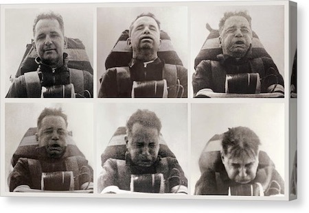 By pretty much all accounts, John Stapp was the central figure. That’s him, undergoing extreme decelleration in a rocket-powered sled, in this series of photos: