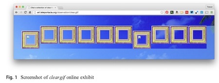 “Widely referred to as ‘spacer’ GIFs, these single-pixel, transparent GIFs were used first and foremost as a way of controlling the placement and presentation of content on a website. They were invisible, or rather transparent, i.e. whatever was behind them showed through. However, they still took up space. So a designer could encode into their HTML document any number of spacer GIFs to appear in a row in order to control the placement of any given element on a page. This provided a means of controlling exactly where visual elements would appear on a given web page. As is evident in Fig. 1, they only become visible when broken, when the link to the image file no longer resolves. These tiny files, the presence of which is only conspicuous when they are no longer present, are invaluable aids… enabling scholarly research on the history of the web.”
