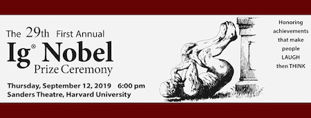 Tickets for the 29th First Annual Ig Nobel Prize ceremony go on sale Wednesday, July 10, 2019, at NOON (US eastern time), exclusively from the Harvard Box Office.