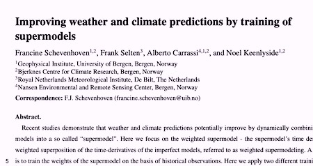 “Improving Weather and Climate Predictions by Training of Supermodels,” Francine Schevenhoven, Frank Selten, Alberto Carrassi, and Noel Keenlyside, Earth System Dynamics, epub 2019. (Thanks to Tom Gill for bringing this to our attention.) The authors, at the University of Bergen, Norway, Bjerknes Centre for Climate Research, Bergen, Norway, Royal Netherlands Meteorological Institute, and Nansen Environmental and Remote Sensing Center, Bergen, Norway, report: