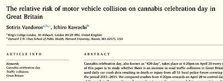 “Cannabis celebration day, also known as ‘420 day‘, takes place at 4:20pm on April 20 every year. The objective of this paper is to study whether there is an increase in road traffic collisions in Great Britain on that day. We used daily car crash data resulting in death or injury from all 51 local police forces covering Great Britain over the period 2011–2015. We compared crashes from 4:20pm onwards on April 20 to control days on the same day of the week in the preceding and succeeding two weeks, using panel data econometric models. On the average cannabis celebration day in Britain, there were an additional 23 police-reported collisions compared to control days, corresponding to a 17.9% increase in the relative risk of collision.”