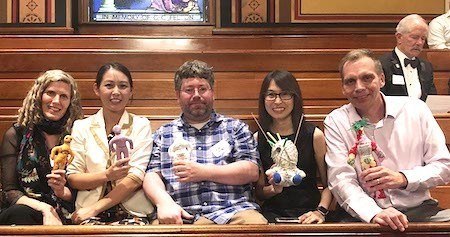 Voodoo dolls in hand, the winning co-authors await their press interviews before the Ig Nobel ceremony at Harvard. Left to right: Prof. Lisa Keeping (Wilfrid Laurier University), Prof. Huiwen Lian (University of Kentucky), Prof. D. Lance Ferris (Michigan State University), Prof. Lindie Liang (Wilfrid Laurier University) and Prof. Douglas Brown (University of Waterloo). Not pictured: Samuel Hanig, a PhD candidate at the University of Waterloo.