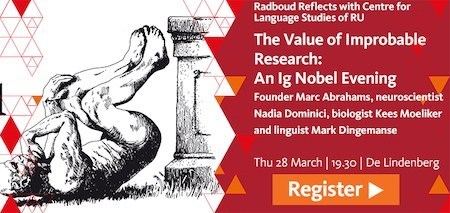 March 28, Thursday, 7:30 pm—The Value of Improbable Research: An Ig Nobel Evening, Nijmegen, The Netherlands, at De Lindenberg, organized by Radboud University and the Centre for Language Studies of RU—TICKETS TICKETS TICKETS. Marc Abrahams and