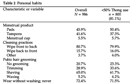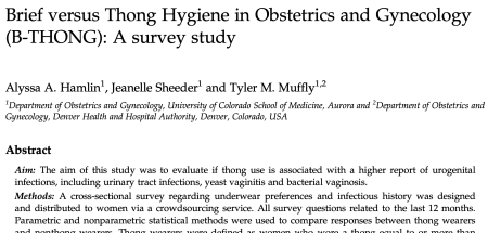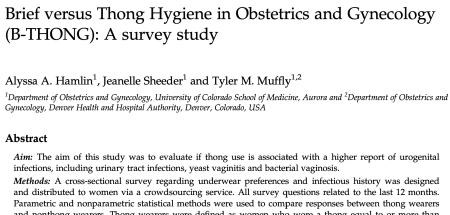 The study is “Brief versus Thong Hygiene in Obstetrics and Gynecology (B-THONG): A survey study,” Alyssa A. Hamlin, Jeanelle Sheeder, and Tyler M. Muffly, Obstestrics and Gynecology Research, vol., 131, May 2018, 108S ff. (Thanks to Gwinyai Masukume for bringing this to our attention.)