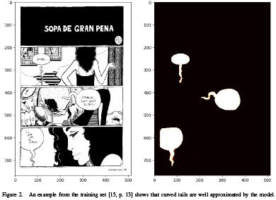 “We develop a method for the automated detection and segmentation of speech balloons in comic books, including their carrier and tails. Our method is based on a deep convolutional neural network that was trained on annotated pages of the Graphic Narrative Corpus…. Qualitative results suggest that wiggly tails, curved corners, and even illusory contours do not pose a major problem. Furthermore, the model has learned to distinguish speech balloons from captions.”