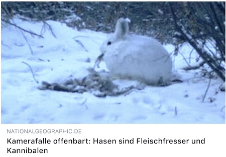 Details about the eating are in a study published in BioOne: “Scavenging By Snowshoe Hares (Lepus americanus) In Yukon, Canada,” by Michael JL Peers, Yasmine N Majchrzak, Sean M Konkolics, Rudy Boonstra, Stan Boutin.