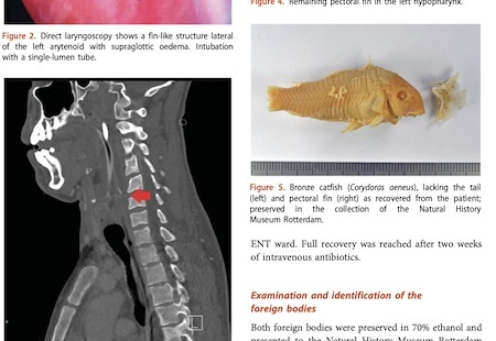 “A Jackass and a Fish: A Case of Life-Threatening Intentional Ingestion of a Live Pet Catfish (Corydoras aeneus),” Linda B.L. Benoist, Ben van der Hoven, Annemarie C. de Vries, Bas Pullens, Erwin J.O. Kompanje, and Cornelis W. Moeliker, Acta Oto-Laryngologica Case Reports, vol. 4, no. 1, 2019. The authors explain: