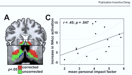 The incentive structure of a scientist’s life is increasingly mimicking economic principles. While intensely criticized, the journal impact factor (JIF) has taken a role as the new currency for scientists. Successful goal-directed behavior in academia thus requires knowledge about the JIF. Using functional neuroimaging we examined how the JIF, as a powerful incentive in academia, has shaped the behavior of scientists and the reward signal in the striatum. We demonstrate that the reward signal in the nucleus accumbens increases with higher JIF during the anticipation of a publication and found a positive correlation with the personal publication record (pJIF) supporting the notion that scientists have incorporated the predominant reward principle of the scientific community in their reward system….