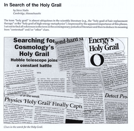 Take the prompt “the holy grail of particle physics,” for instance, which yields 119,000 results, whereas “the holy grail of cosmology” delivers a bit less at 107,000 results. Here are some other examples (presented in ranked, descending order), as gleaned from the world’s leading search engine: