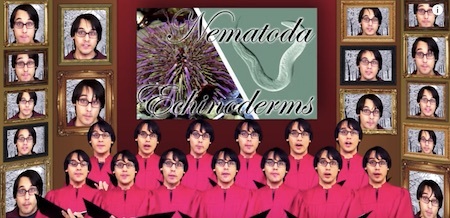 Behold, or more to the point, listen to this performance by the (sometimes one-person) singing group A Capella Science, of “The Animalia Chorus”:
