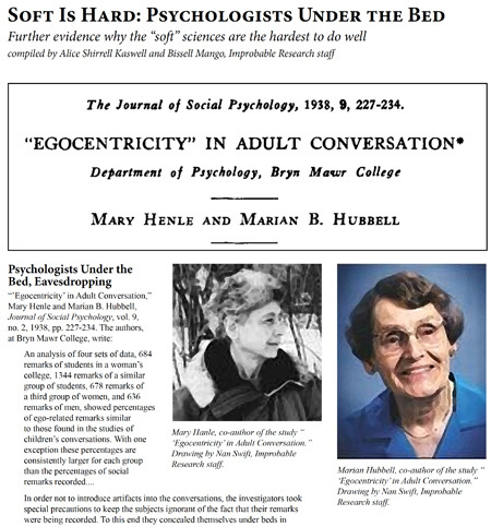 “ ’Egocentricity’ in Adult Conversation,” is one of several studies featured in the article “Soft Is Hard: Psychologists Under the Bed — further evidence why the ‘soft’ sciences are the hardest to do well,” which is one of the articles in the special Numbers issue of the Annals of Improbable Research, which is one of the 142 issues published so far!