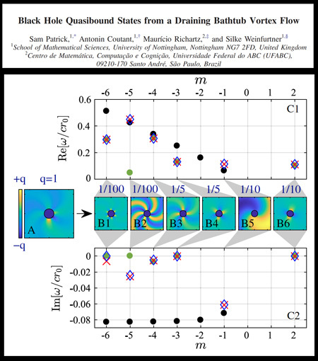 “Black Hole Quasibound States from a Draining Bathtub Vortex Flow,” Sam Patrick, Antonin Coutant, Maurício Richartz, and Silke Weinfurtner, Physical Review Letters, vol. 121, nos. 6-10, 2018, 061101. The authors, at the University of Nottingham, UK, and Universidade Federal do ABC (UFABC), Brazil, report: