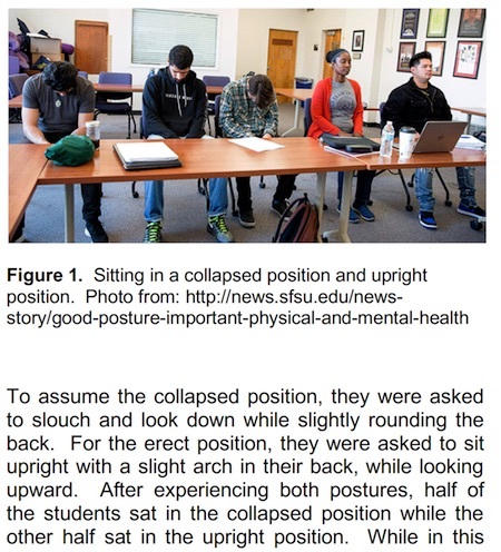 “This study investigates posture on mental math performance. 125 students (M = 23.5 years) participated as part of a class activity. Half the students sat in an erect position while the other half sat in a slouched position and were asked to mentally subtract 7 serially from 964 for 30 seconds. They then reversed the positions before repeating the math subtraction task beginning at 834. They rated the math task difficulty on a scale from 0 (none) to 10 (extreme). The math test was rated significantly more difficult while sitting slouched (M = 6.2) than while sitting erect (M = 4.9) ANOVA [F(1,243) = 17.06, p < 0.001]…. Discussed are processes such as stereotypic threat associated with a ‘defense reaction’ by which posture can affect mental math and inhibit abstract thinking.”