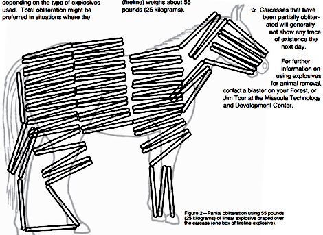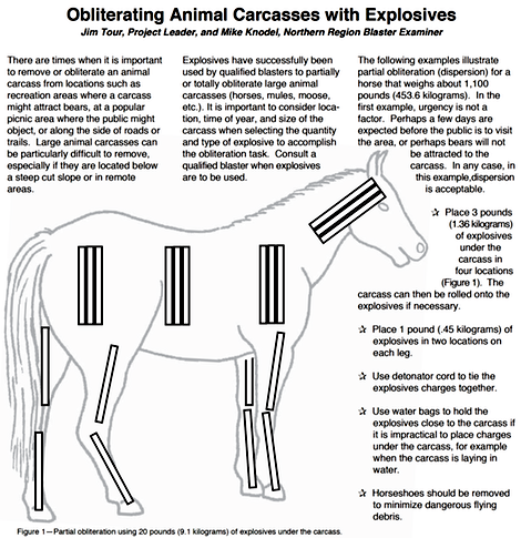 We have discussed, here, “How to blow up a cow (officially),” and also the story of “Deciding not to blow up a cow (officially).” Both of those discussions involve the US Forest Service’s standard procedure as specified in the document “Obliterating Animal Carcasses with Explosives,” by Jim Tour and Mike Knodel, 1995, USDA Forest Service document #9523-2315–MTDC. The document begins by showing how to proceed if there is no great urgency: