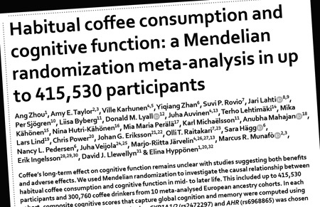 “Coffee’s long-term effect on cognitive function remains unclear with studies suggesting both benefits and adverse effects. We used Mendelian randomization to investigate the causal relationship between habitual coffee consumption and cognitive function in mid- to later life. This included up to 415,530 participants and 300,760 coffee drinkers from 10 meta-analysed European ancestry cohorts. In each cohort, composite cognitive scores that capture global cognition and memory were computed using available tests.”