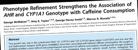 “Phenotype refinement strengthens the association of AHR and CYP1A1 genotype with caffeine consumption,” George McMahon, Amy E. Taylor, George Davey Smith, and Marcus R. Munafo, PloS One, vol. 9, no. 7, 2014, e103448. The authors report:
