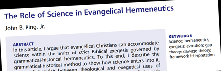 “The Role of Science in Evangelical Hermeneutics,” John B. King Jr., Theology and Science, epub 2018. The author explains: