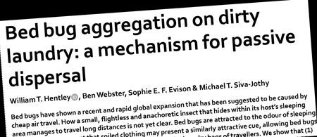 “Bed Bug Aggregation on Dirty Laundry: A Mechanism for Passive Dispersal,” William T. Hentley, Ben Webster, Sophie E.F. Evison, and Michael T. Siva-Jothy, Scientific Reports, vol. 7, no. 11668, 2017. The authors, at the University of Sheffield, UK, report: