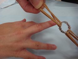 “Rubber bands were chosen over string as they grip the ring slightly, facilitating oscillation around the digit. Furthermore, the technique does not harm the ring and the ring cannot fall to the floor after removal.”
