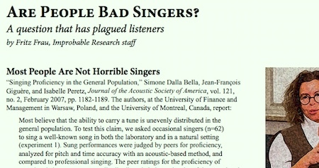 “Are People Bad Singers?”, in the special Music issue of the Annals of Improbable Research, gathers research about that high-pitched question. Read the article free (PDF). Then, if you dare, purchase the issue, or subscribe to the magazine.