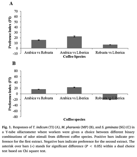 In a series of Y-tube olfactometer bioassays, we examined the behavioral responses of Tapinoma indicum (TI), Monomorium pharaonis (MP) and Solenopsis geminata (SG) to various coffee-induced odor stimuli, comprised of extracts from Arabica, Robusta and Liberica….