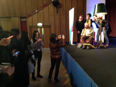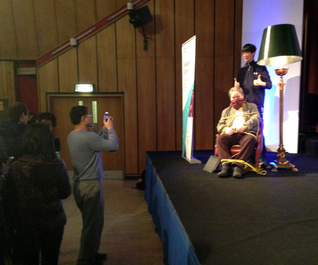 The entire Ig Nobel show began, proceeded, and finished during Colgan’s evening-long on-stage tenure. Here are photos of that performance by Stevyn Colgan. Many audience members clambered onto the stage to have their photographs taken with Colgan.