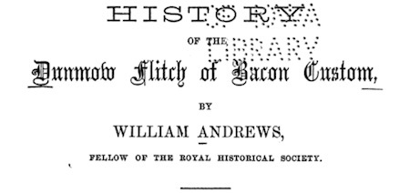 History of the Dunmow Flitch of Bacon Custom, a book by William Andrews, published in 1877, tells of the British custom involving married couples publicly swearing an oath about themselves, in pursuit of free bacon.