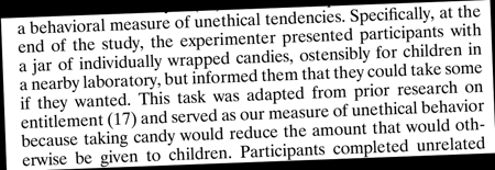 “at the end of the study, the experimenter presented participants with a jar of individually wrapped candies, ostensibly for children in a nearby laboratory, but informed them that they could take some if they wanted. This task was adapted from prior research on entitlement and served as our measure of unethical behavior because taking candy would reduce the amount that would otherwise be given to children…. Central to our hypothesis, participants in the upper-class rank condition took more candy that would otherwise go to children than did those in the lower-rank condition.”