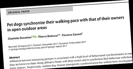 “Pet Dogs Synchronize Their Walking Pace With That of Their Owners In Open Outdoor Areas,” Charlotte Duranton, Thierry Bedossa, and Florence Gaunet, Animal Cognition, epub 2017. The authors, at Aix-Marseille University, AVA Association [Cuy-Saint-Fiacre], and Alfort National Veterinary School, France, explain: