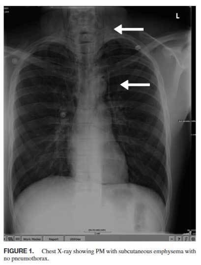 “A 16-year-old female with a history of type 1 diabetes presented to the Emergency Department (ED) with shortness of breath. She denied chest pain or sore throat. She reported a sudden onset of symptoms after forceful screaming at the ‘‘One Direction’’ concert the night prior. She denied any preceding emesis, odynophagia, or cough. Her physical examination revealed tachypnea to 22 breaths/min with normal breath sounds and no respiratory distress. A Hamman’s crunch was not appreciated.”