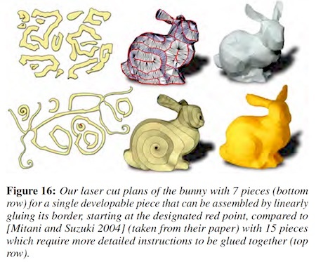 “We observe that the assembly of complex 3D shapes created by existing methods often requires first fabricating many small flat parts and then carefully following instructions to assemble them together. Despite its significance, this error prone and tedious process is generally neglected in the discussion. We propose an approach for shape representation through a single developable part that attaches to itself and requires no assembly instructions. Our inspiration comes from the so-called zipit bags, which are made of a single, long ribbon with a zipper around its boundary. In order to ‘assemble’ the bag, one simply needs to zip up the ribbon. Our method operates in the same fashion, but it can be used to approximate any shape.”