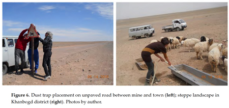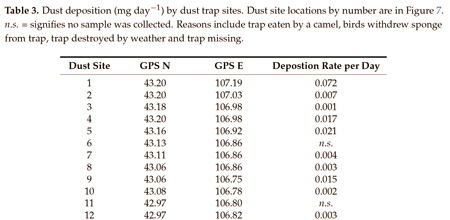 “Dust deposition (mg day-1) by dust trap sites. Dust site locations by number are in Figure 7. n.s. = signifies no sample was collected. Reasons include trap eaten by a camel…”