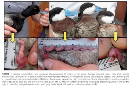“Evidence of phenotypic plasticity of penis morphology and delayed reproductive maturation in response to male competition in waterfowl,” Patricia L.R. Brennan, Ian Gereg, Michele Goodman, Derek Feng, and Richard O. Prum, The Auk, vol. 134, 2017, pp. 882–893. The authors report: