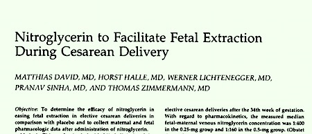 “Nitroglycerin to Facilitate Fetal Extraction During Cesearean Delivery,” M. David, H. Halle, W. Lichtenegger, P. Sinha, and T. Zimmerman, Obstetrics and Gynecology, vol. 91, no. 1, January 1998, pp. 119-24. (Thanks to Richard Leavitt for bringing this to our attention.) The authors are, or were, at Humboldt University in Berlin.