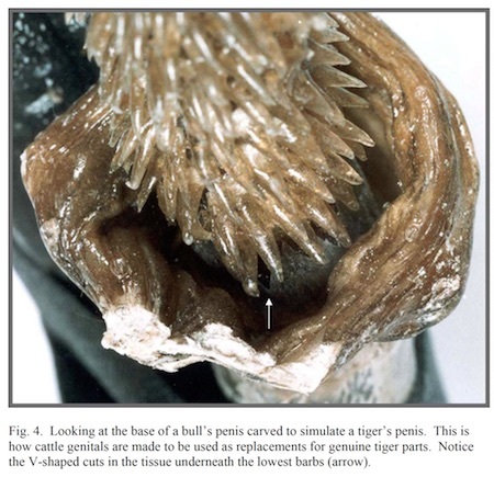 The photo above, from the report, comes with this caption: “Fig. 4. Looking at the base of a bull’s penis carved to simulate a tiger’s penis. This is how cattle genitals are made to be used as replacements for genuine tiger parts. Notice the V-shaped cuts in the tissue underneath the lowest barbs (arrow).”