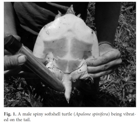“While most species of turtle exhibit secondary sexual dimorphisms that can be used to reliably infer sex, there are some species that are very difficult to sex, and even within many dimorphic species, it is not uncommon to encounter individuals that appear to exhibit both male and female secondary sex characteristics. Therefore, we tested the novel method of using a vibrator to sex turtles by stimulating male turtles to evert their penises. We tested this method on males of four species (three families) with known sexual dimorphisms: spiny softshell turtles (Apalone spinifera; n = 14), western chicken turtles (Deirochelys reticularia miaria; n = 17), Mississippi mud turtles (Kinosternon subrubrum hippocrepis; n = 10), and common musk turtles (Sternotherus odoratus; n = 9). The method accurately sexed 100% of A. spinifera, 64.7% of D. r. miaria, 80.0% of K. s. hippocrepis, and 55.6% of S. odoratus.”