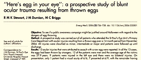 ” ‘Here’s Egg in Your Eye’: A Prospective Study of Blunt Ocular Trauma Resulting from Thrown Eggs,” R.M.K. Stewart, J.M. Durnian, and M. C. Briggs, of Liverpool University Hospital, published in Emergency Medical Journal, vol. 23, 2006, pp. 756-8.