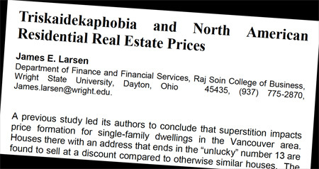 “Triskaidekaphobia and North American Residential Real Estate Prices,” James E. Larsen, International Real Estate Review, vol. 18, no. 3, 2015, pp. 317-329.