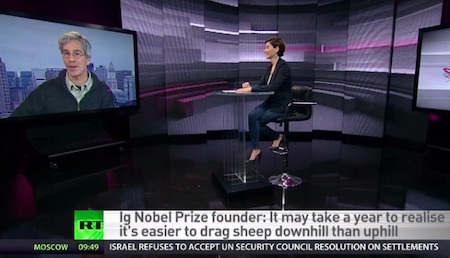 Sophie Shevardnadze interviewed me about the Ig Nobel Prizes, on the RT network’s “Sophie & Co.” program. I had cut myself shaving, that morning, before traveling to the TV studio. In the video here, you can see me bleeding all over Russian TV for a half hour while discussing improbable research with Sophie: