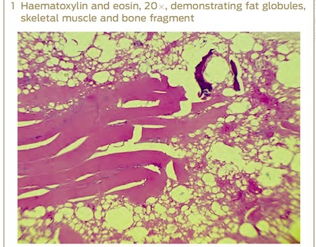 Specimens were procured both from vendors in a public location and from a commercial supermarket…. Sections from all specimens showed similar histological composition. [The] majority of the cross-sections of hot dogs consisted of fat globules. There was a wide but consistent range of tissues present, including but not limited to: bone, cartilage, blood vessels, skeletal muscle and… fragments of vegetable matter…. However, no squamous mucosa was identified.