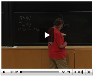 John Conway writes the words SPIN, TWIN, MIN and FIN on a blackboard. Watch him do it, if you will (so to speak), in this video: