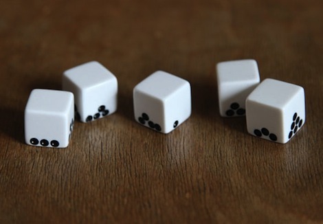 These dice, the work of Suzy Leleviere, are visibly under the influence of gravity. They appear to be firmly seated on the surface of a table: