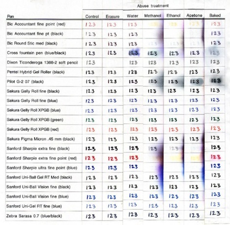 Results: Bics and Sharpies do surprisingly badly, while #2 pencils stand up to everything except, umm, erasers. (True story: In journalism school, you’re taught to always carry a pencil in case you have to take notes in the rain.) And as a pen geek, I am intrigued by the brilliantly performing, and evocatively named, Sakura Pigma Micron .45.