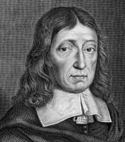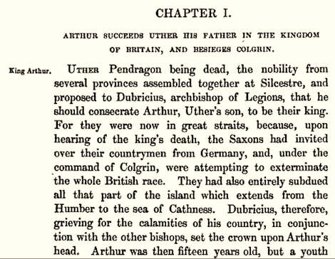 … Indeed, a reputation as a bungler who doesn’t know his patronyms (son of the horrible one/Uther) from his epithets (horrible son) is about the best that Geoffrey could hope for during his three centuries in disgrace. Once a historian realizes, as Milton [pictured here] did sometime between 1638 and 1670, that Geoffrey was an outrageously inventive and brazen liar and that his History [a glimpse of which is shown here, below] is almost complete fabrication from beginning to end, repudiation usually gives rise to open contempt. As our awareness of the scope of his lies increases, it becomes increasingly hard to credit Geoffrey with anything original, and this is, in part, the reason so many are willing to hypothesize into existence a vast, internally consistent Arthurian biography floating around somewhere that Geoffrey must have copied down poorly and without giving credit….