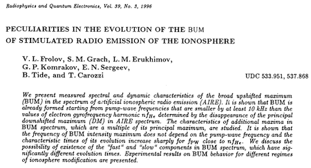 “Peculiarities in the evolution of the BUM of stimulated radio emission of the ionosphere,” V. L. Frolov, S. M. Grach, L. M. Erukhimov, G. P. Komrakov, E. N. Sergeev, B. Tide and T. Carozzi, Radiophysics and Quantum Electronics, Volume 39, Number 3, 1996, 241-254.