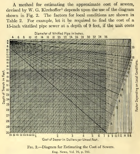Nowadays there are many methods for estimating the approximate cost of sewers. In 1922, this diagram showed the then-state of the art: